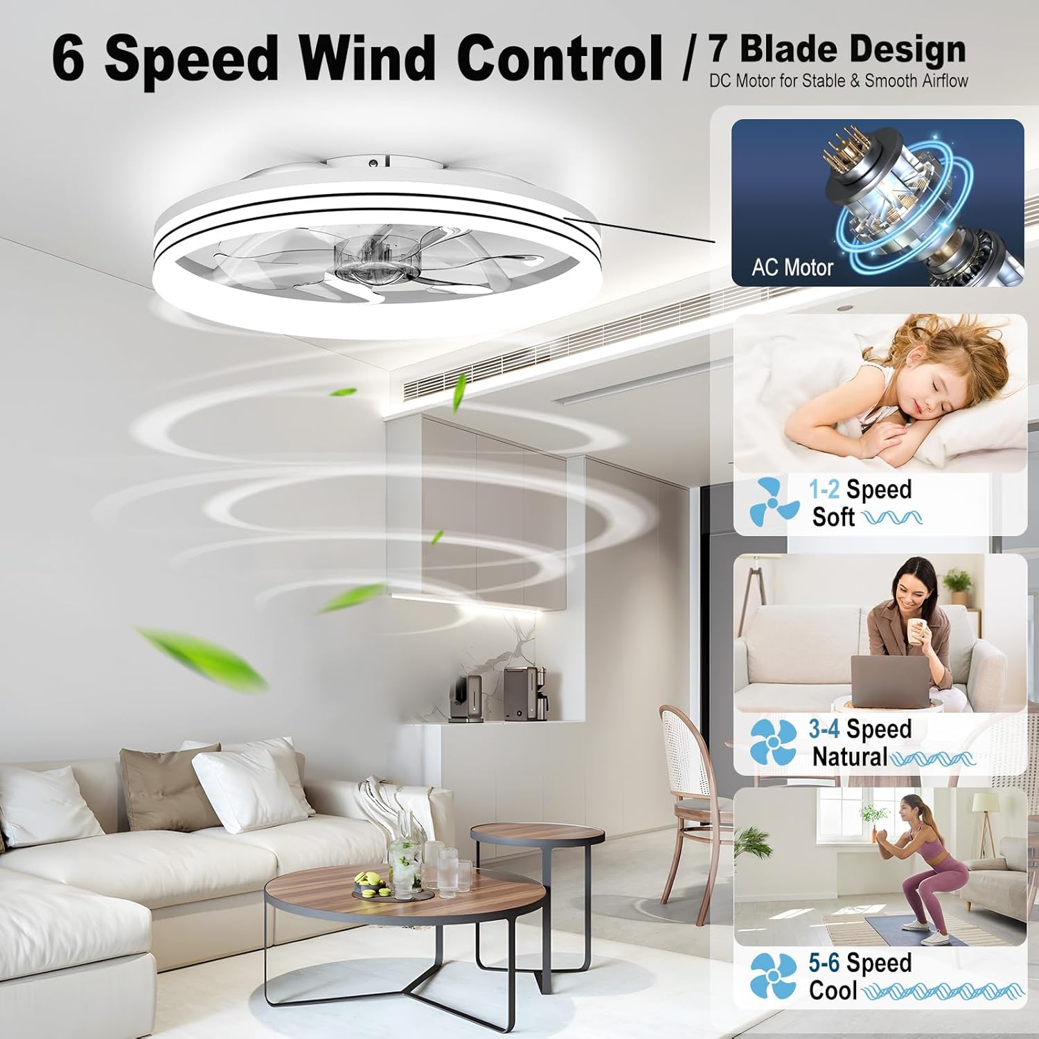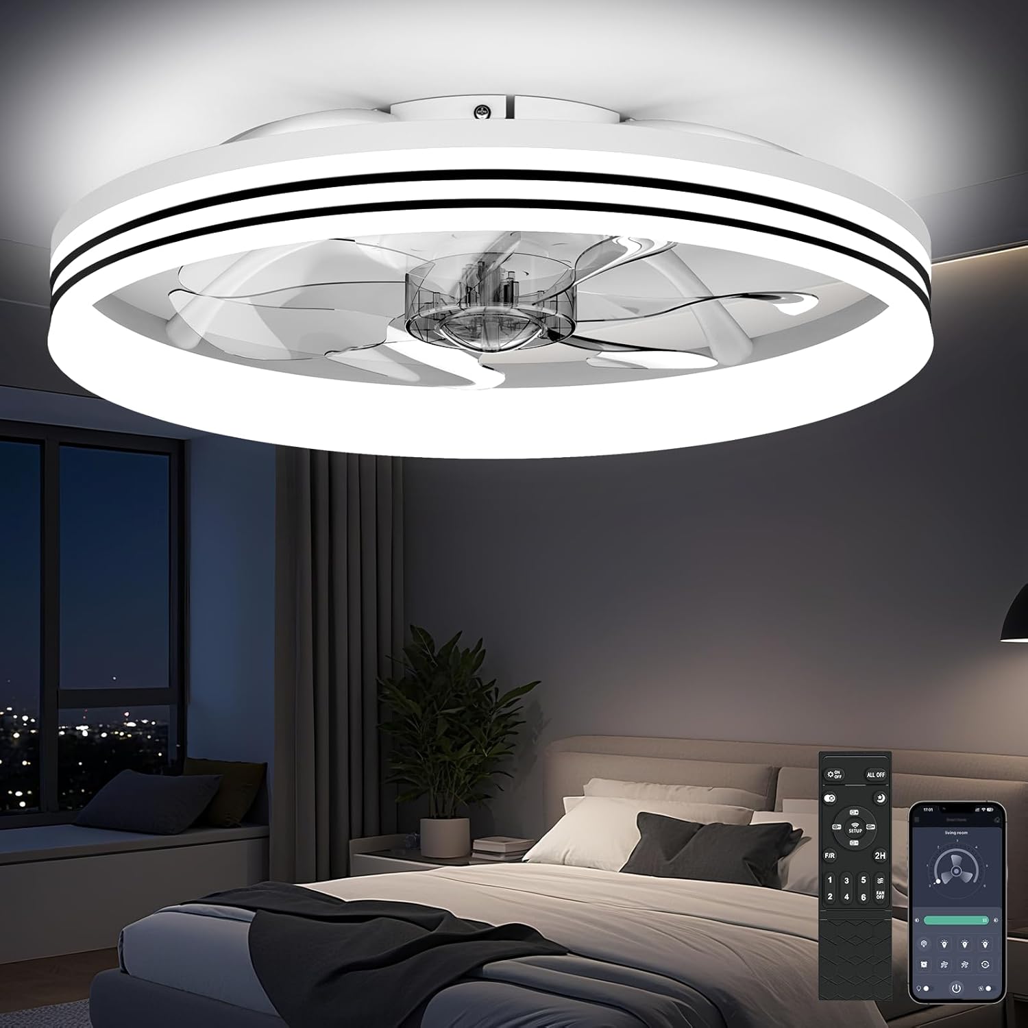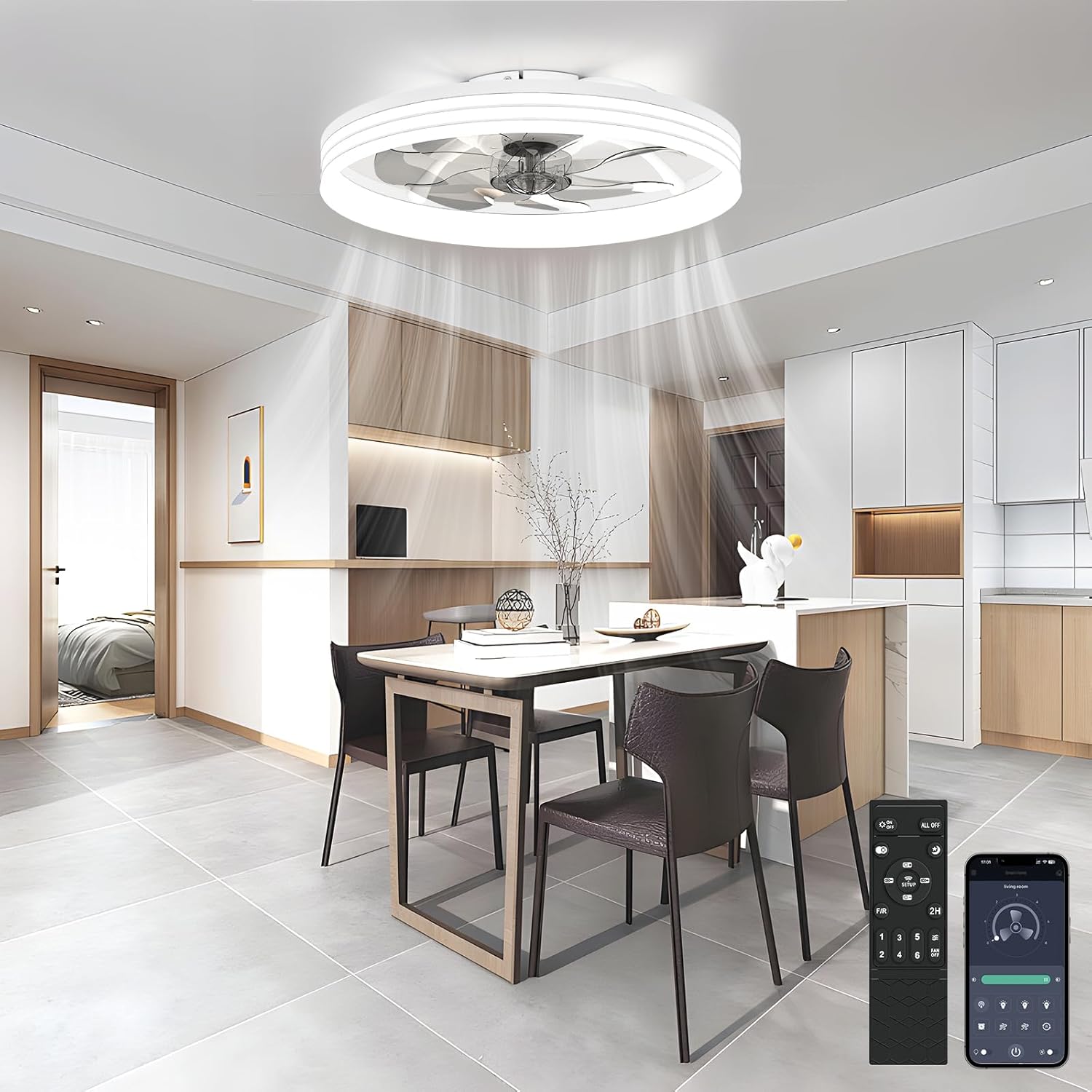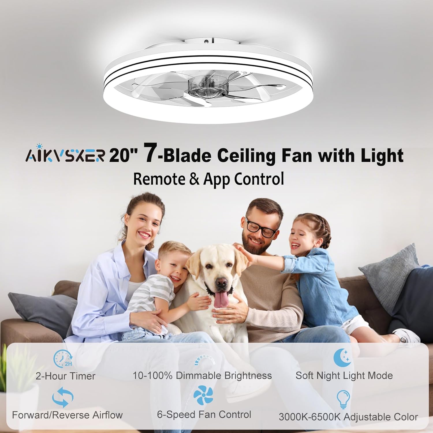 AIKVSXER Ceiling Fan with Light,20" Flush Mount Ceiling Fan,6 Speeds,3000-6500K Dimmable LED, App & Remote Control, Quiet DC Motor, for Bedroom, Living Room Modern Ceiling Fans with Lights(White)