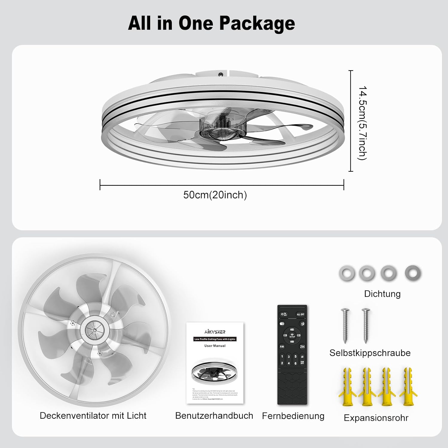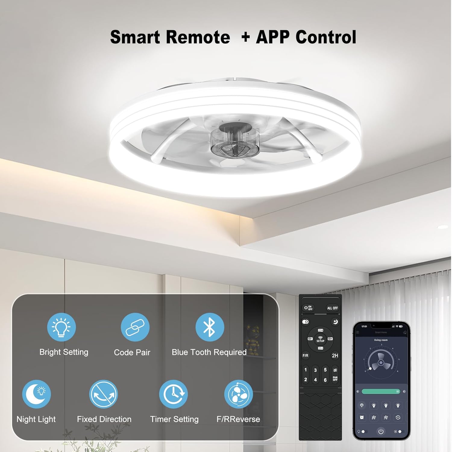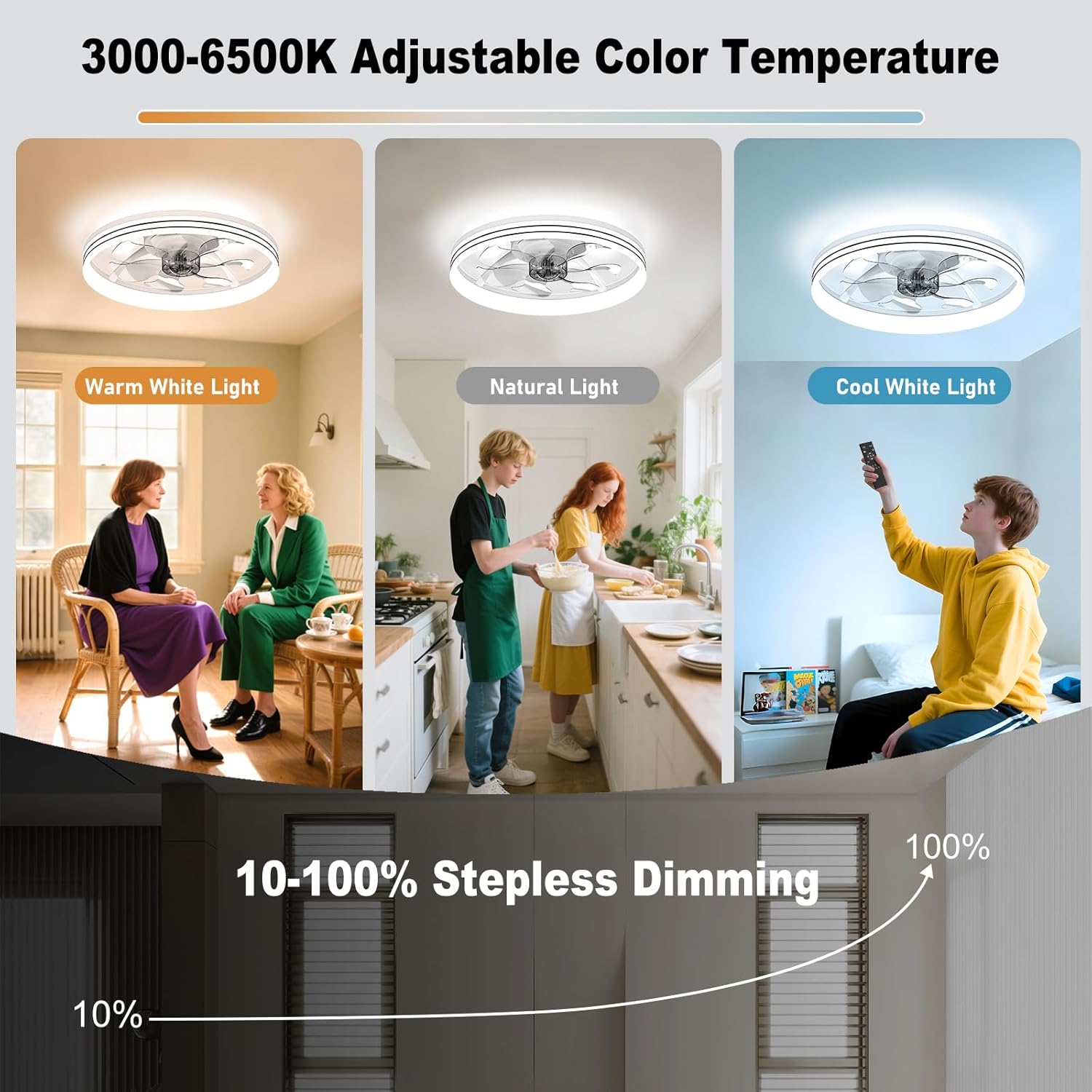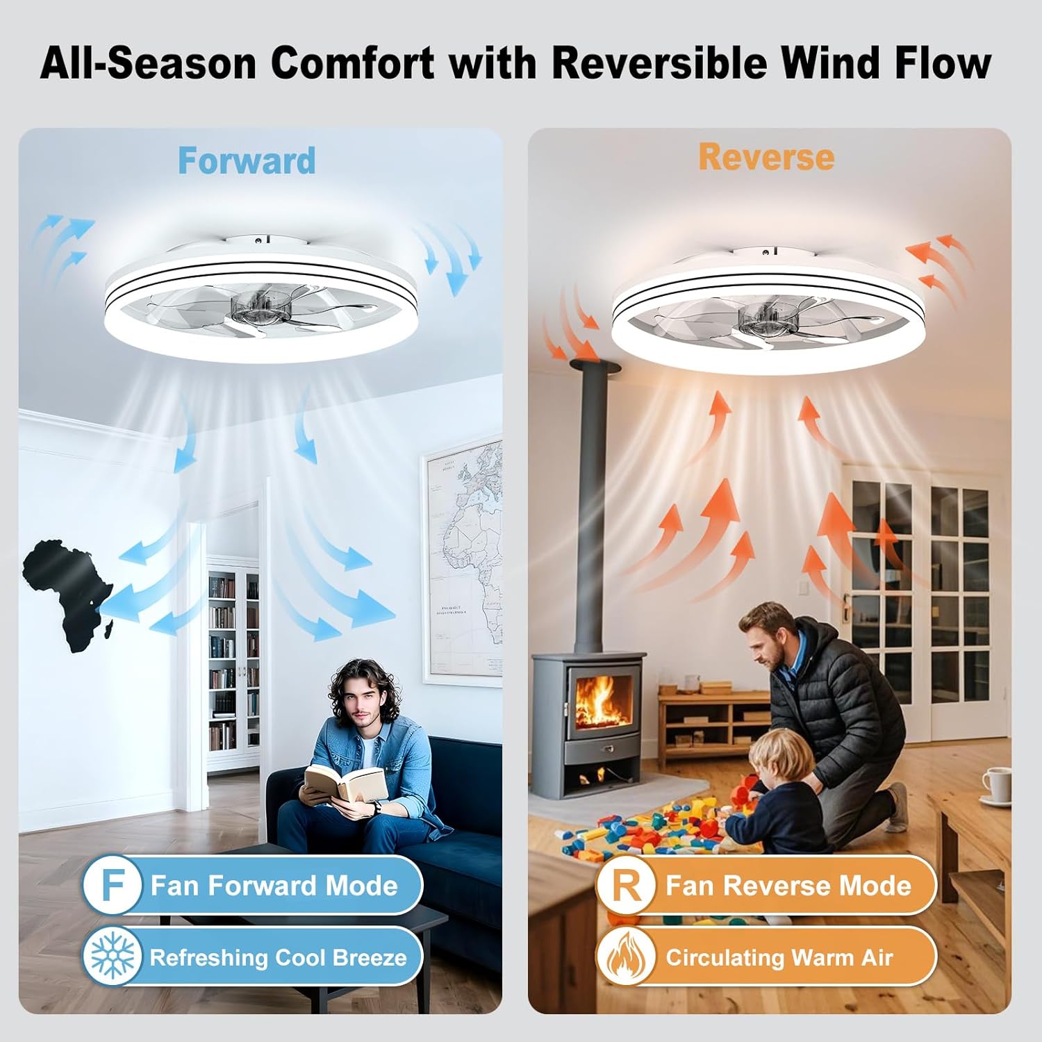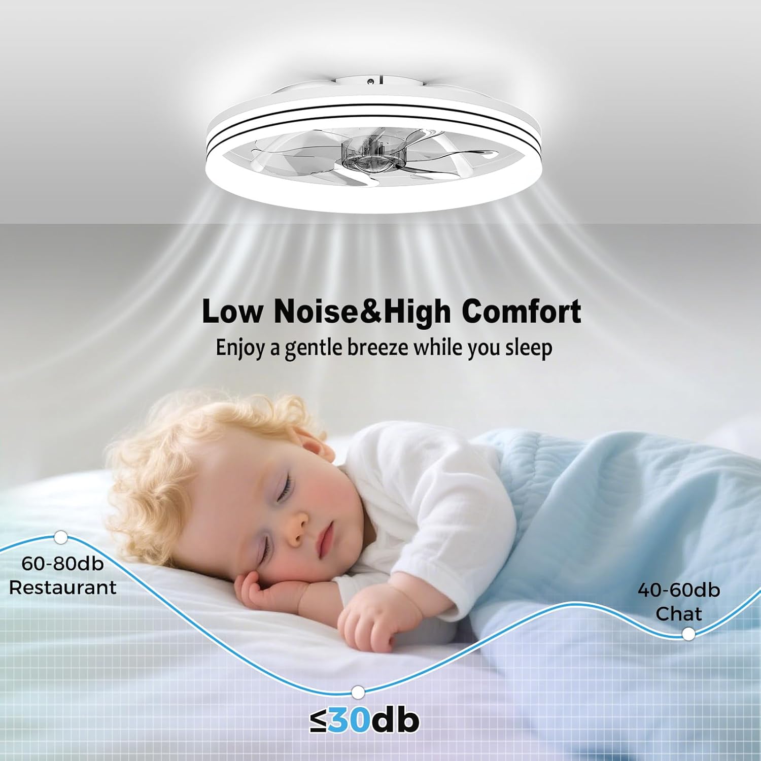 AIKVSXER Ceiling Fan with Light,20" Flush Mount Ceiling Fan,6 Speeds,3000-6500K Dimmable LED, App & Remote Control, Quiet DC Motor, for Bedroom, Living Room Modern Ceiling Fans with Lights(White)