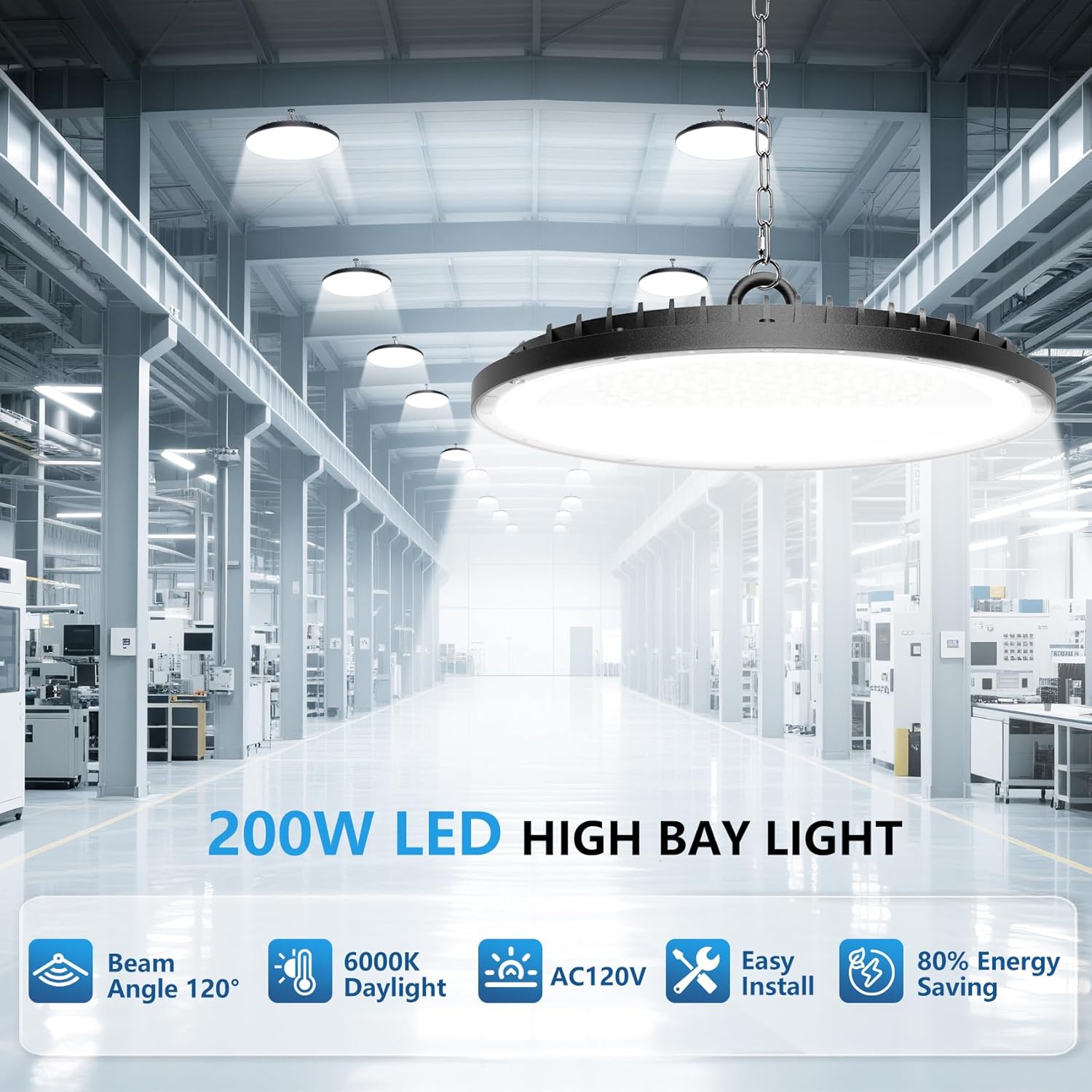 AIKVSXER 200W UFO LED High Bay Light, 30000LM Shop Lights, 6000K Garage Lights IP65 Waterproof Commercial Bay Lighting for Warehouse, Gym, Factory, Workshop Plug & Play, 5FT Power Cord 1 Pack