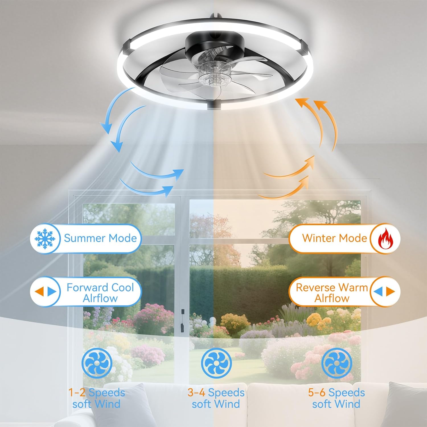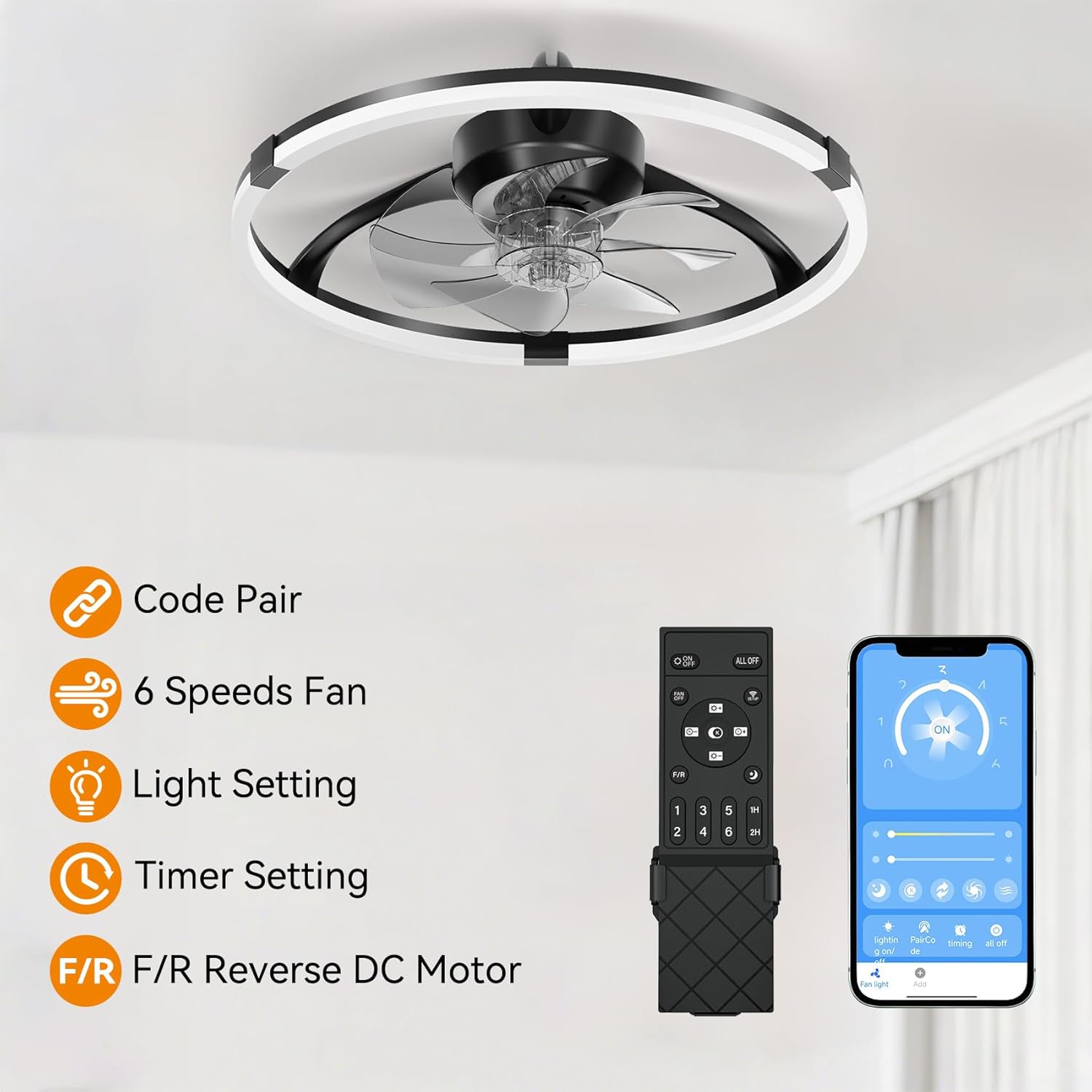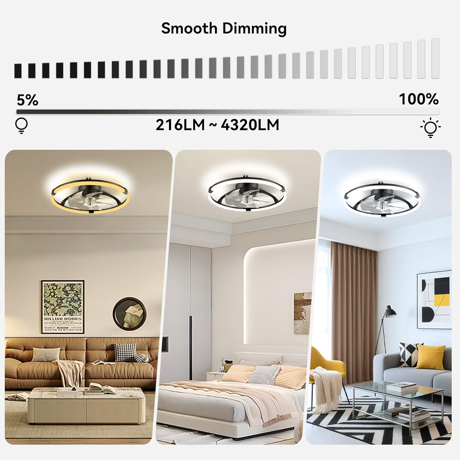 Ceiling Fans with Lights and Remote, 20'' Low Profile Ceiling Fan, 3000-6500K Dimmable Modern Flush Mount LED Fan Light, 6 Wind Speeds, Ceiling Fans for Bedroom